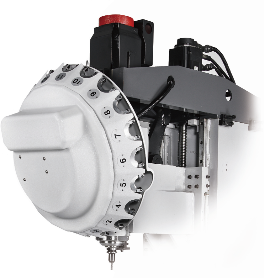 鉆攻刀庫由電機(jī)、渦輪蝸桿機(jī)構(gòu)、減速機(jī)、刀夾、感應(yīng)開關(guān)、刀庫鑄鐵本體、外防護(hù)特殊塑料鈑金等組成,因其外形,也稱為太陽式刀庫或飛碟式刀庫,目前刀庫的刀具數(shù)量有16T和21T。